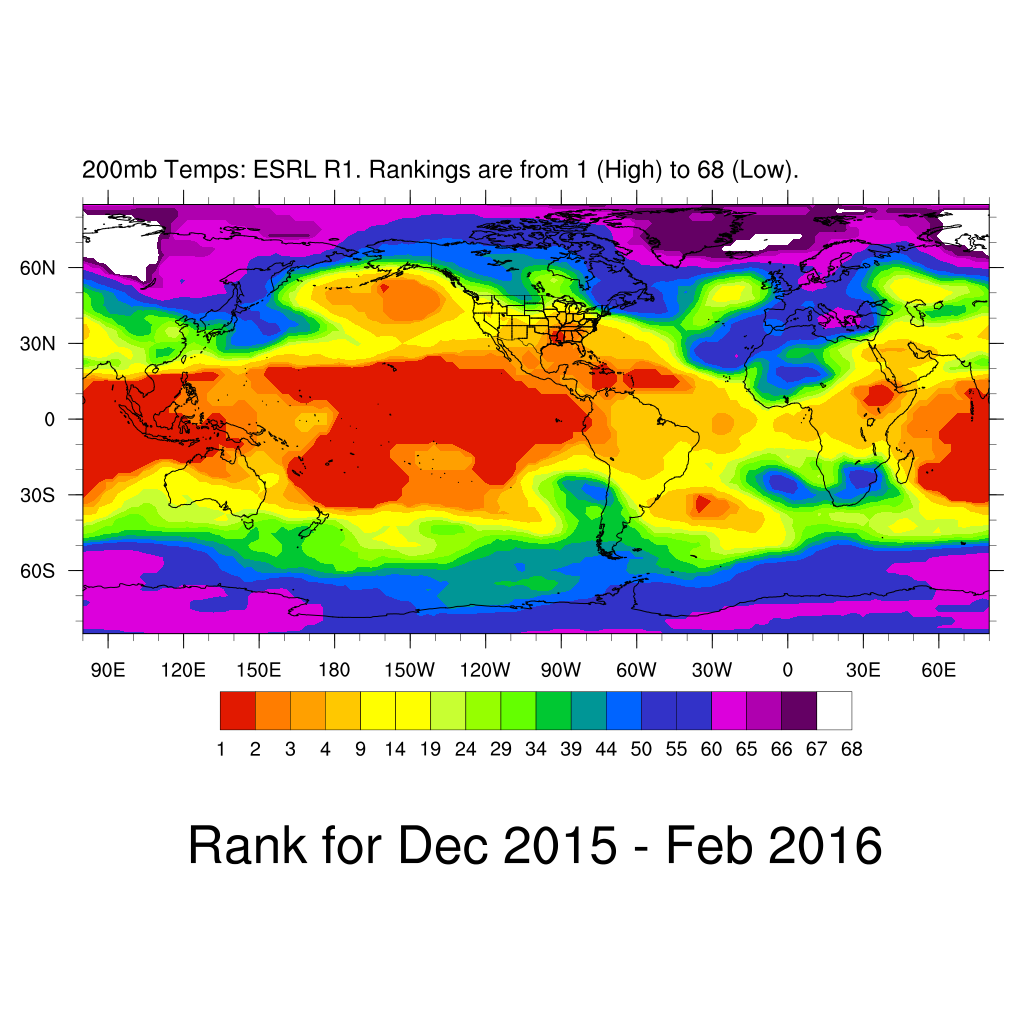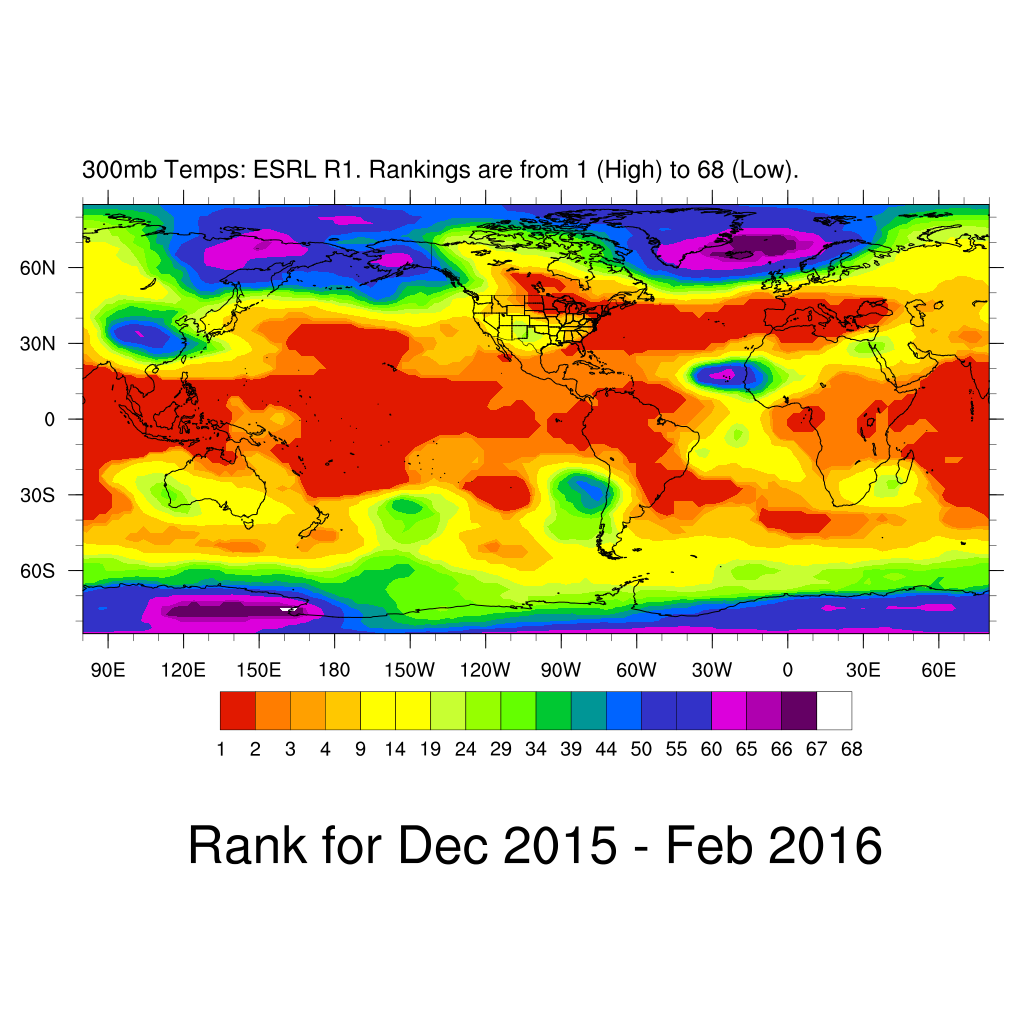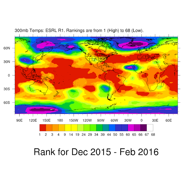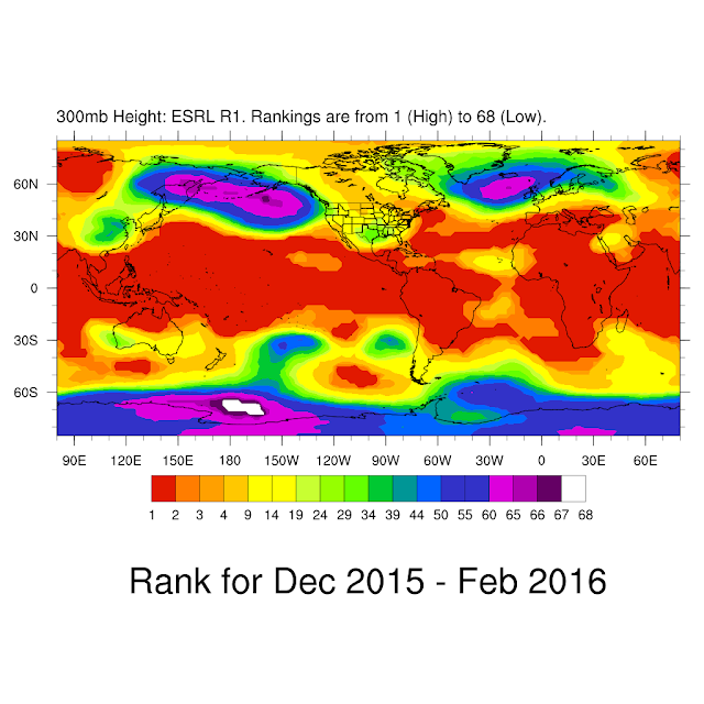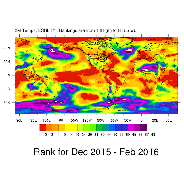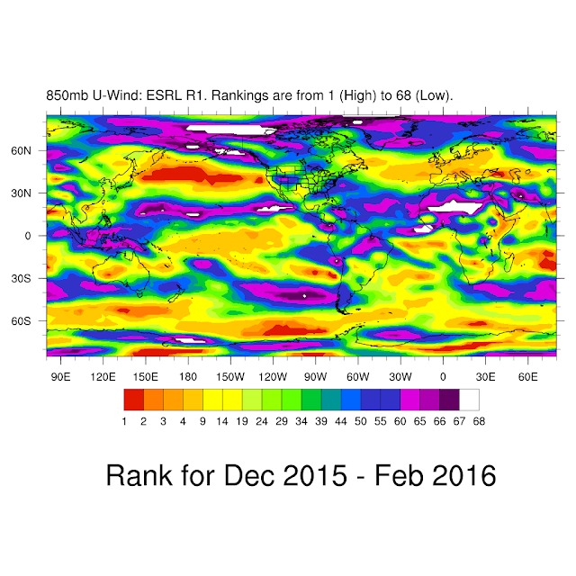 Here are some new reanalysis (R1) rankings for the December 2015 - February 2016 (DJF) climatological winter. The values in the maps below compare the this most recent DJF period with every previous DJF period going back to the winter of 1948-1949. Whenever you see a dark red color, it represents the highest value on record (68 years). A white color represents the lowest value on record. Here are the maps. A companion blog post with a Northern Hemisphere perspective is found HERE.