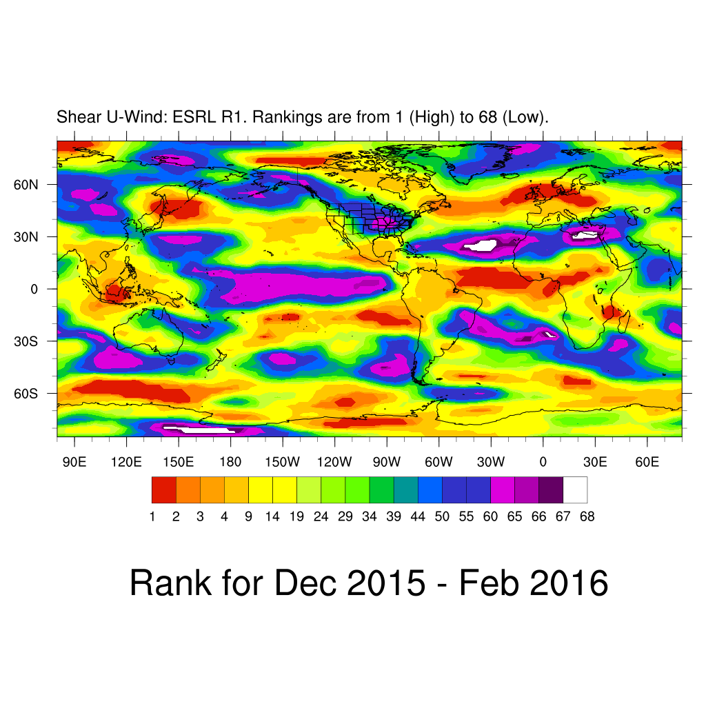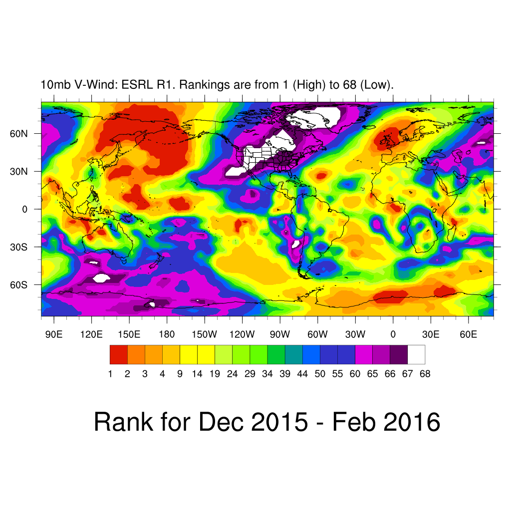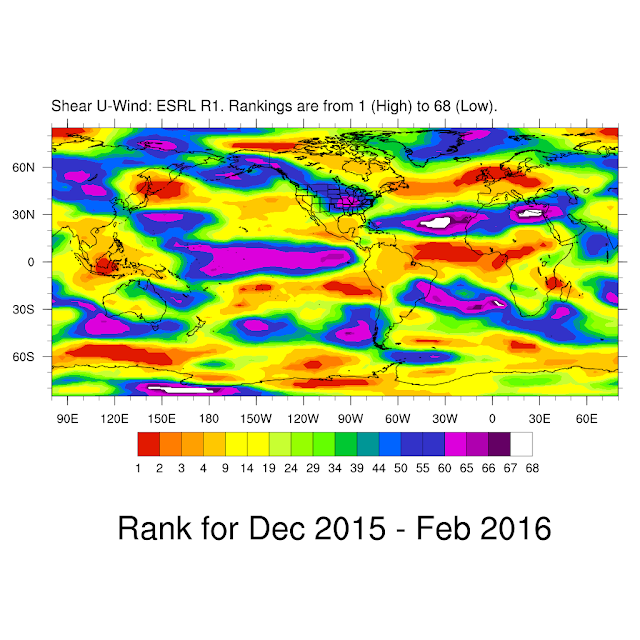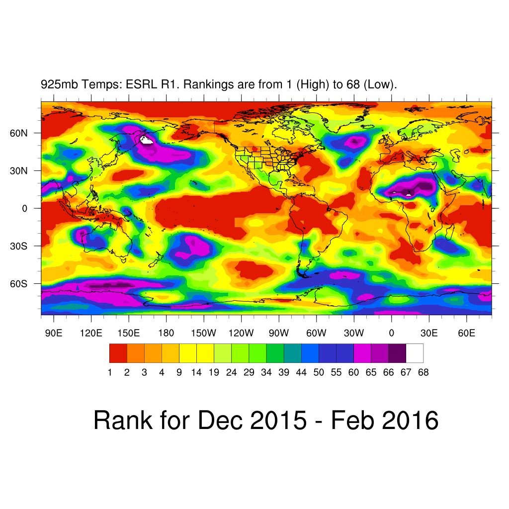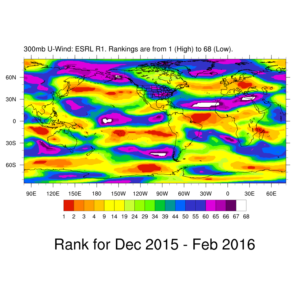 Here are some new reanalysis (R1) rankings for the December 2015 - February 2016 (DJF) climatological winter. The values in the maps below compare the this most recent DJF period with every previous DJF period going back to the winter of 1948-1949. Whenever you see a dark red color, it represents the highest value on record (68 years). A white color represents the lowest value on record. Here are the maps. A companion blog post with a Northern Hemisphere perspective is found HERE.